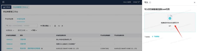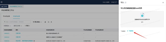 先点击本地供应商 -> 点击导入 ->下载模板,根据最新的模板把必填的信息填好后,再点击"拖拽点击此处文件上传"。