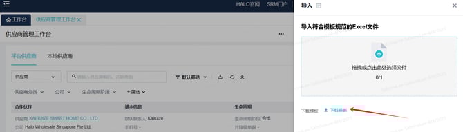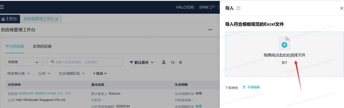 先点击平台供应商 -> 供应商导入生成 ->下载模板,根据最新的模板把必填的信息填好后,再点击"拖拽点击此处文件上传"。