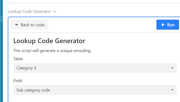 - Select Category 9 table and Sub Category Code field. Click Run.