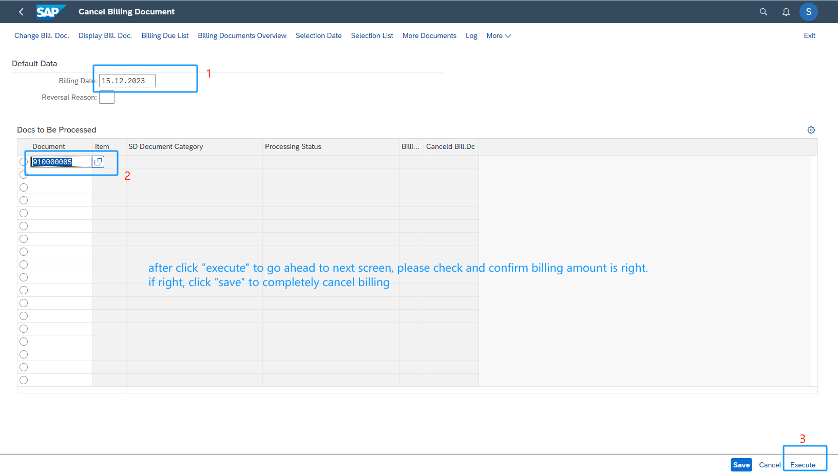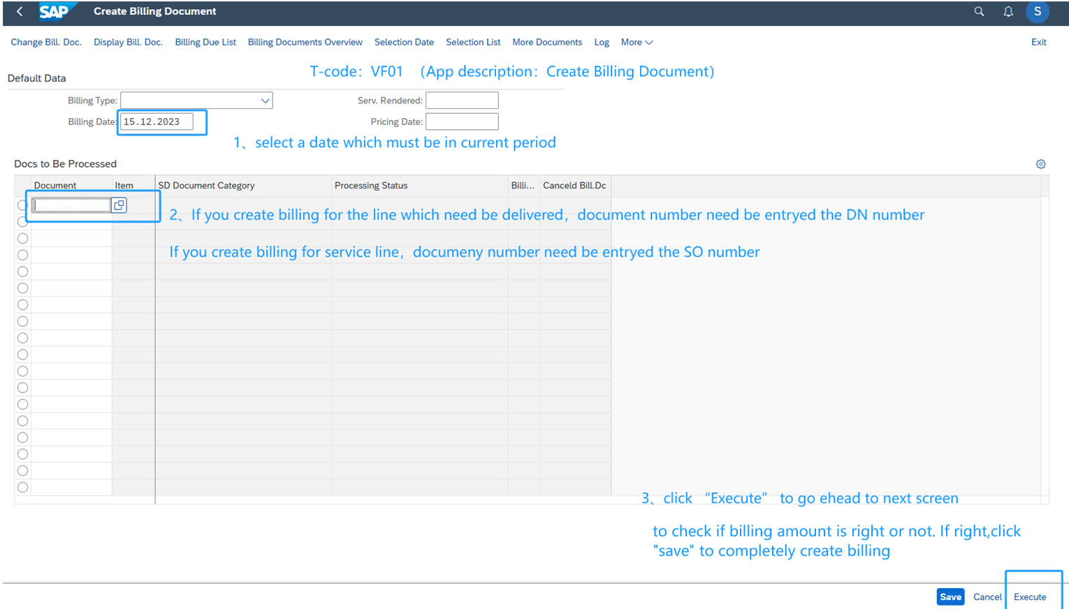 Billing Access Create billing Change Billing:Billing can be changed only when it's not posted. You can display the document flow to check if billing is post or not. Cancel Billing: