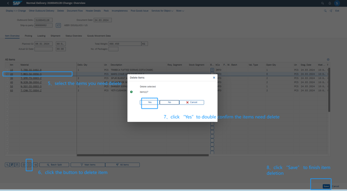 If you just need to cancel some items or refund some items,you should only delete some items for customer delivery note.