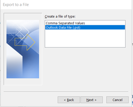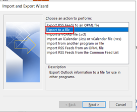 3. Choose the option ‘Export to a file’ and ‘NEXT’, then choose ‘OUTLOOK DATA FILE. Pst’