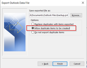 5. The default location is “C:\Users\yourname\Documents\Outlook Files”, and you can save any location. You can also select the duplicated items from exporting.