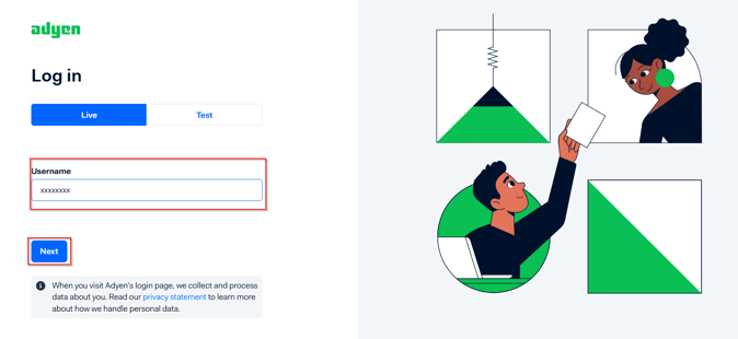 1, Access Adyen web site via URL: https://www.adyen.com and insert your account User Name and hit NEXT ,