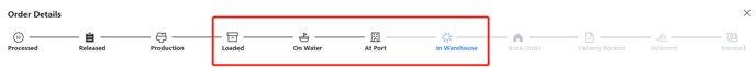 1. The order in TMS is loaded/ on water/ at port/ in warehouse