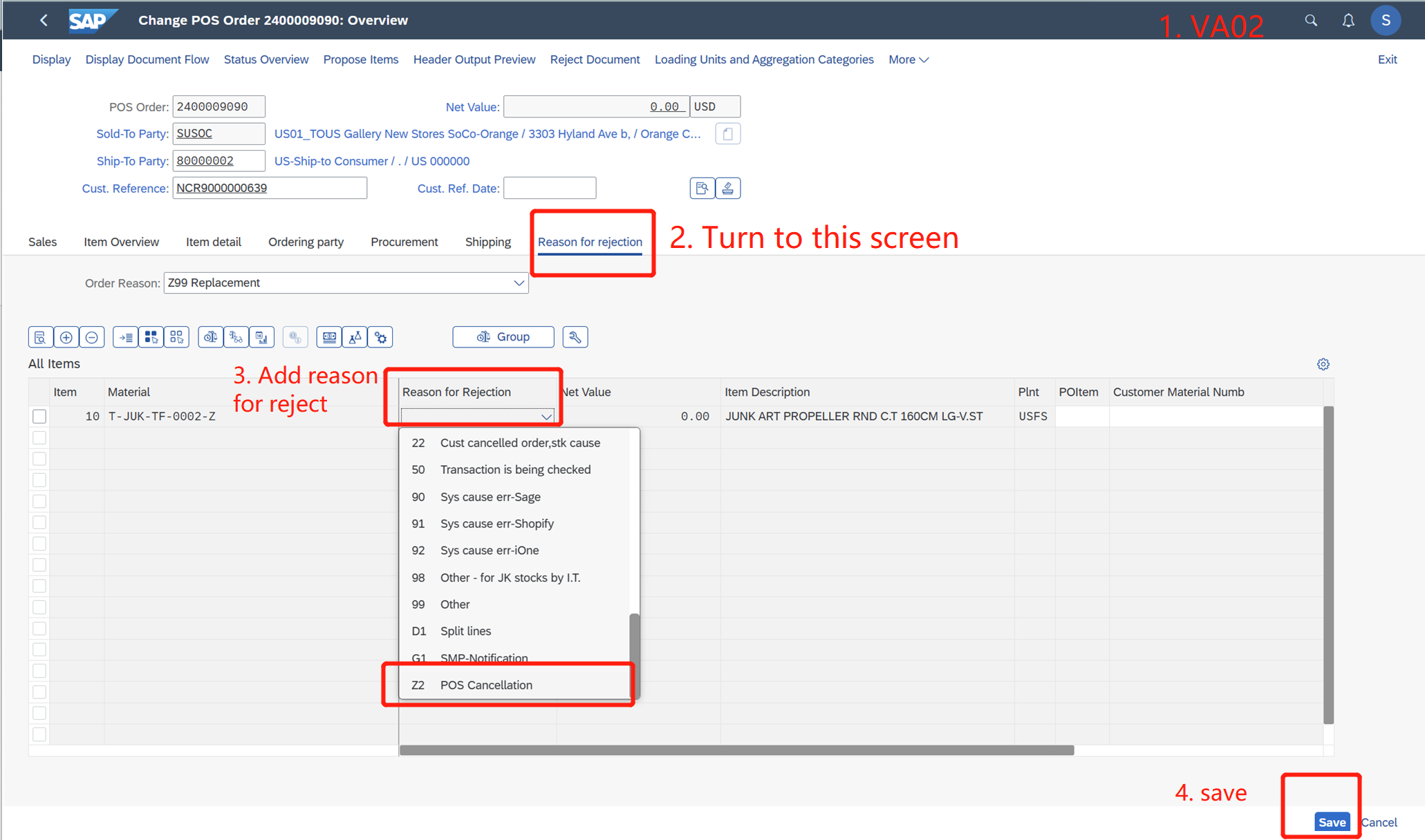 3. After the DN is deleted, go to T-code "VA02" change the sales order. Add a reject reason for this order.