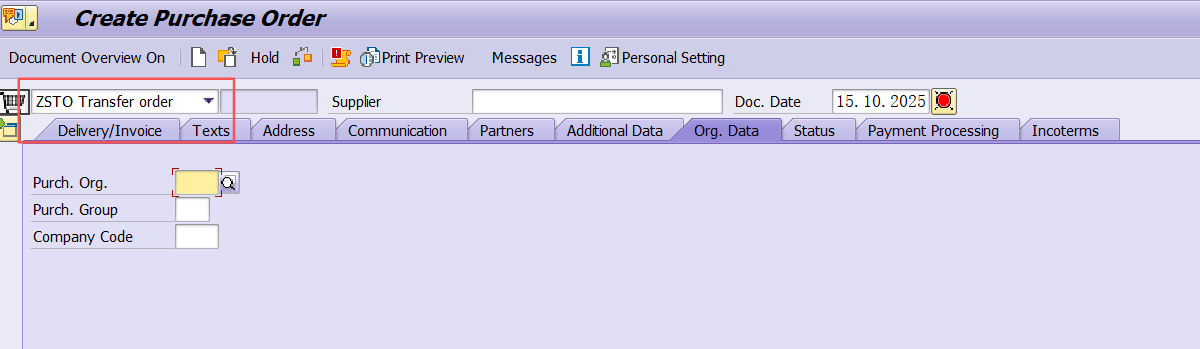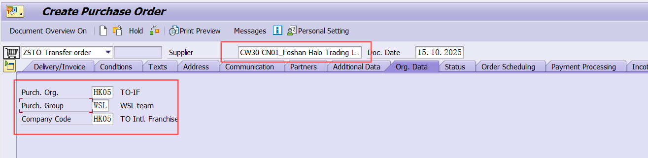 Supplier = CW30, Fill in Purch. Org. , Purch. Group, Company Code