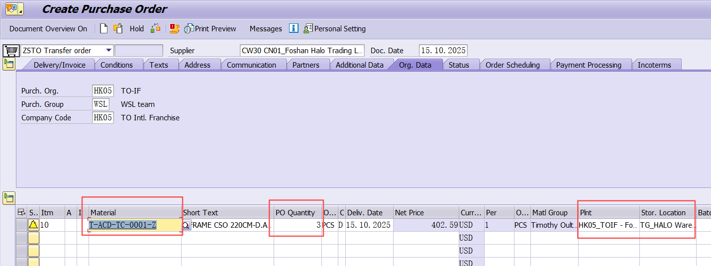 创建PO=CCSTO,如果是MTS PO type 选ZSTO