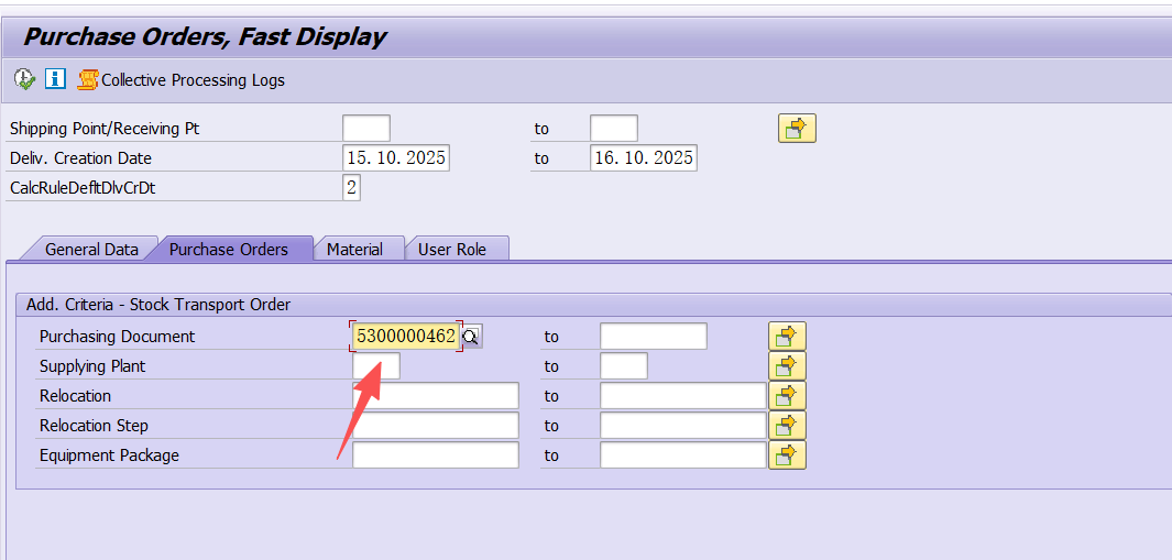 Tcode:VL10B . 创建CCSTO DN, fill in Purchasing document