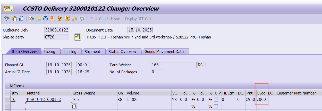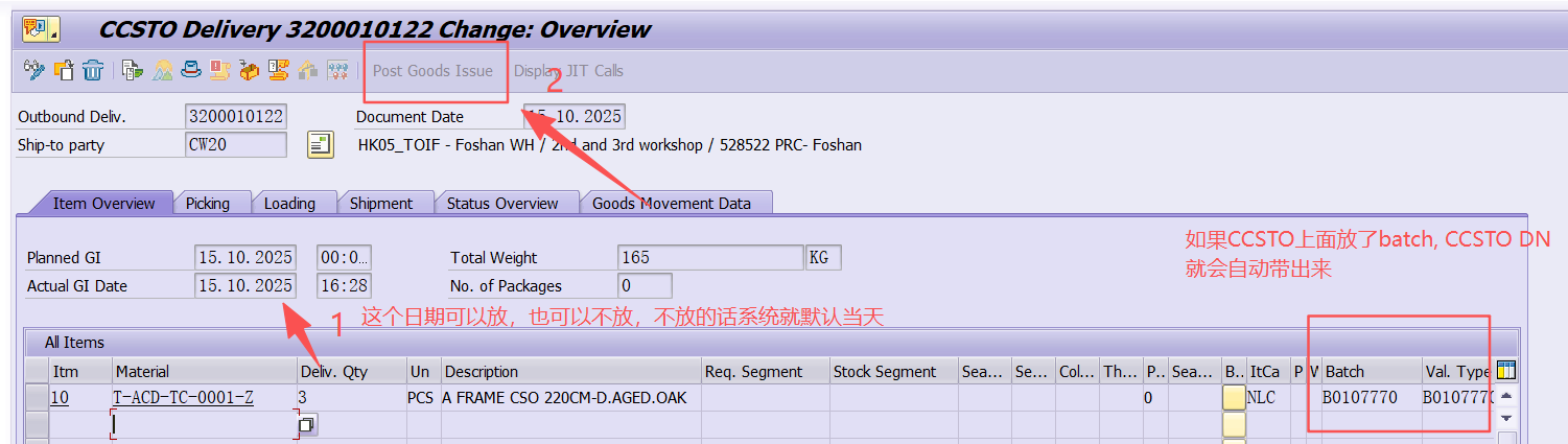 点击 "post good issue", PGI就完成了,也就是说CW30=WOFE的库存已经扣掉。PGI的日期可放可不放,不放系统就默认当天。BATCH 和SLOC 这两个地方,如果CCSTO 有填就会自动带到CCSTO DN,如果CCSTO没有填,那么CCSTO DN需要维护。