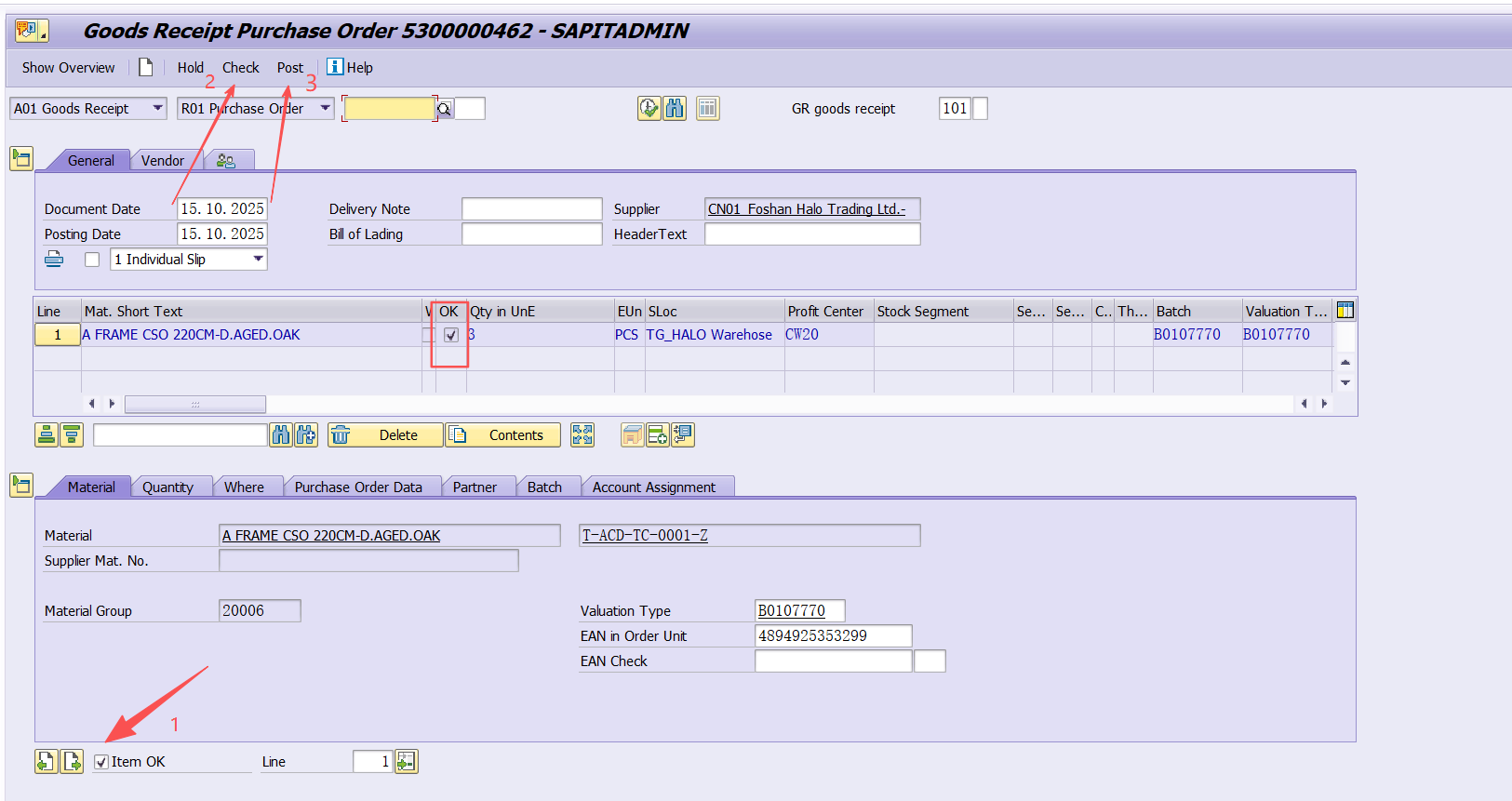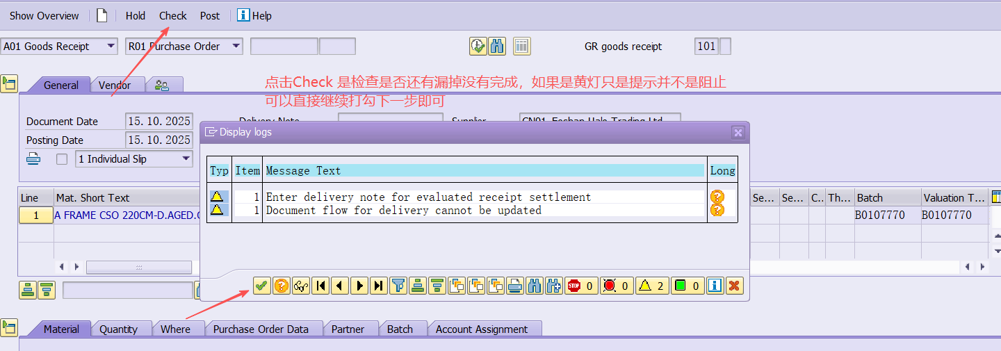 点击“Item OK”, 确保行上是打勾的,然后点击“Check", 如果没有问题,一般会出黄灯提示。如果有问题会出红灯阻止不给收货。