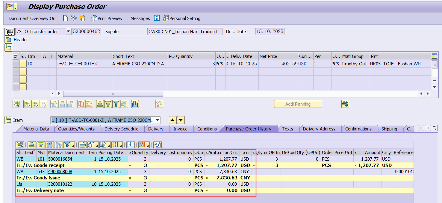以上步骤完成可以回去ME23N查看CCSTO “Purchase Order History", 看到这个就是整个CCSTO完成,从CW30转到CW20的流程