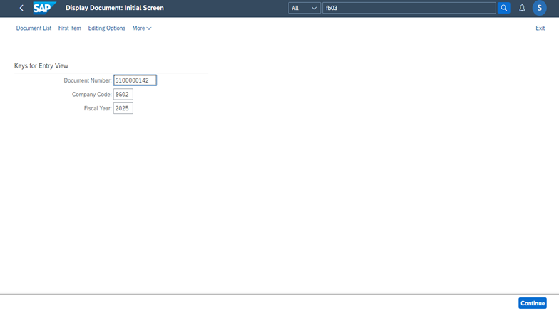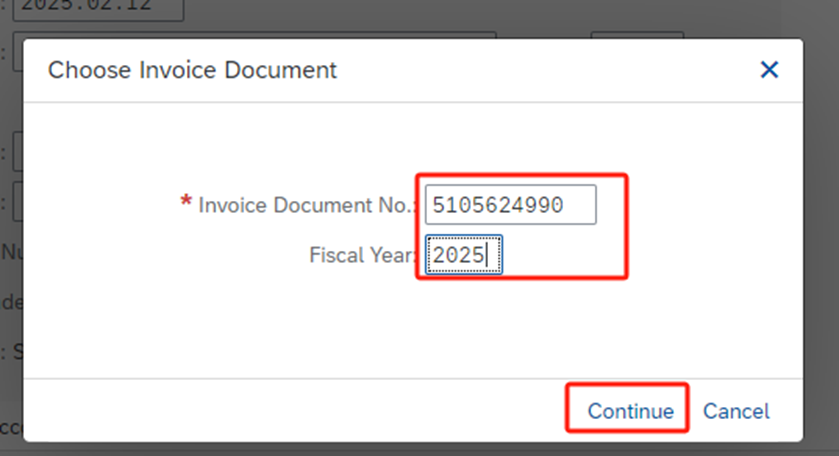 Enter the supplier invoice document number and fiscal year that found in Step 2.