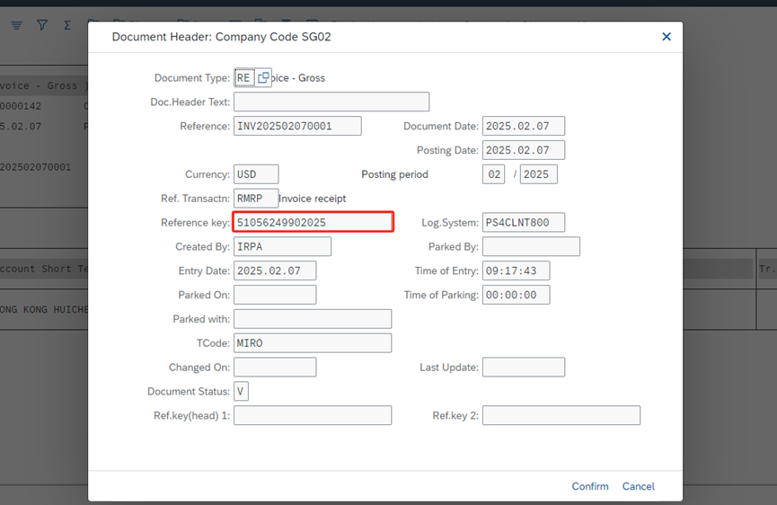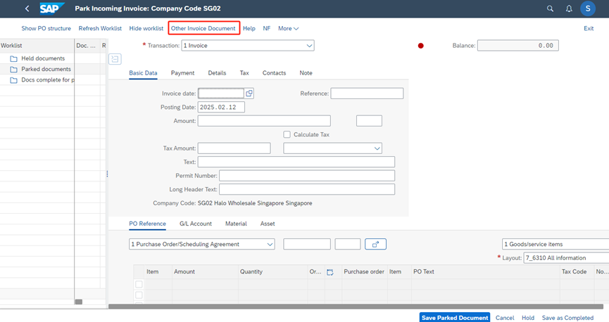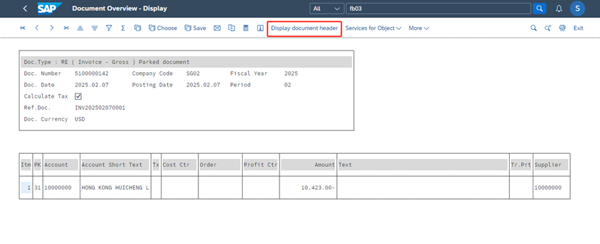 Note: The parked document we want to delete is generated by an integrated supplier invoice document, so what needs to be deleted is this supplier invoice document. This is different from deleting parked manual GL document.