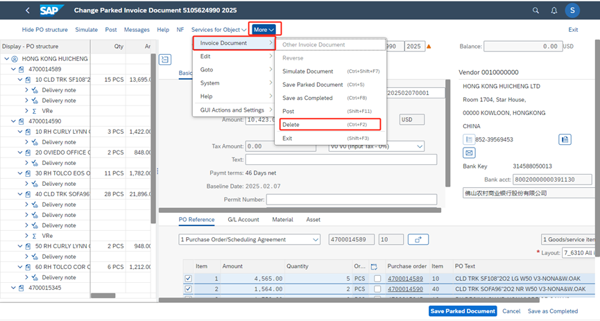 After inspection and confirmation, it is necessary to delete this parked supplier invoice document, we can click more -> invoice document ->delete. Then this parked supplier invoice and corresponding parked FI document will be deleted together.
