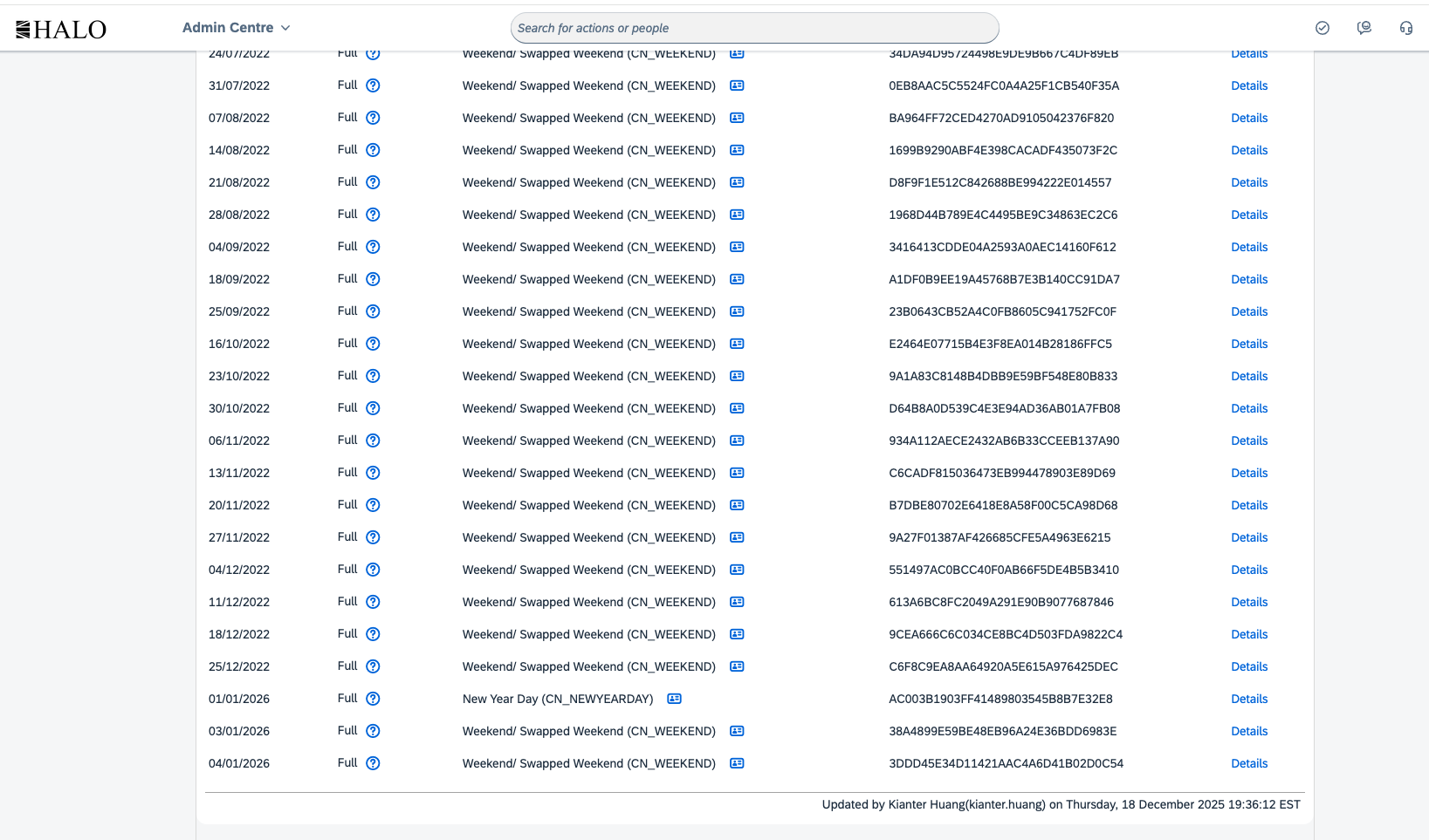 holidayAssignments.holidayClass: FULL or HALF (if it is the full day, then select FULL, if just half day, then select HALF)