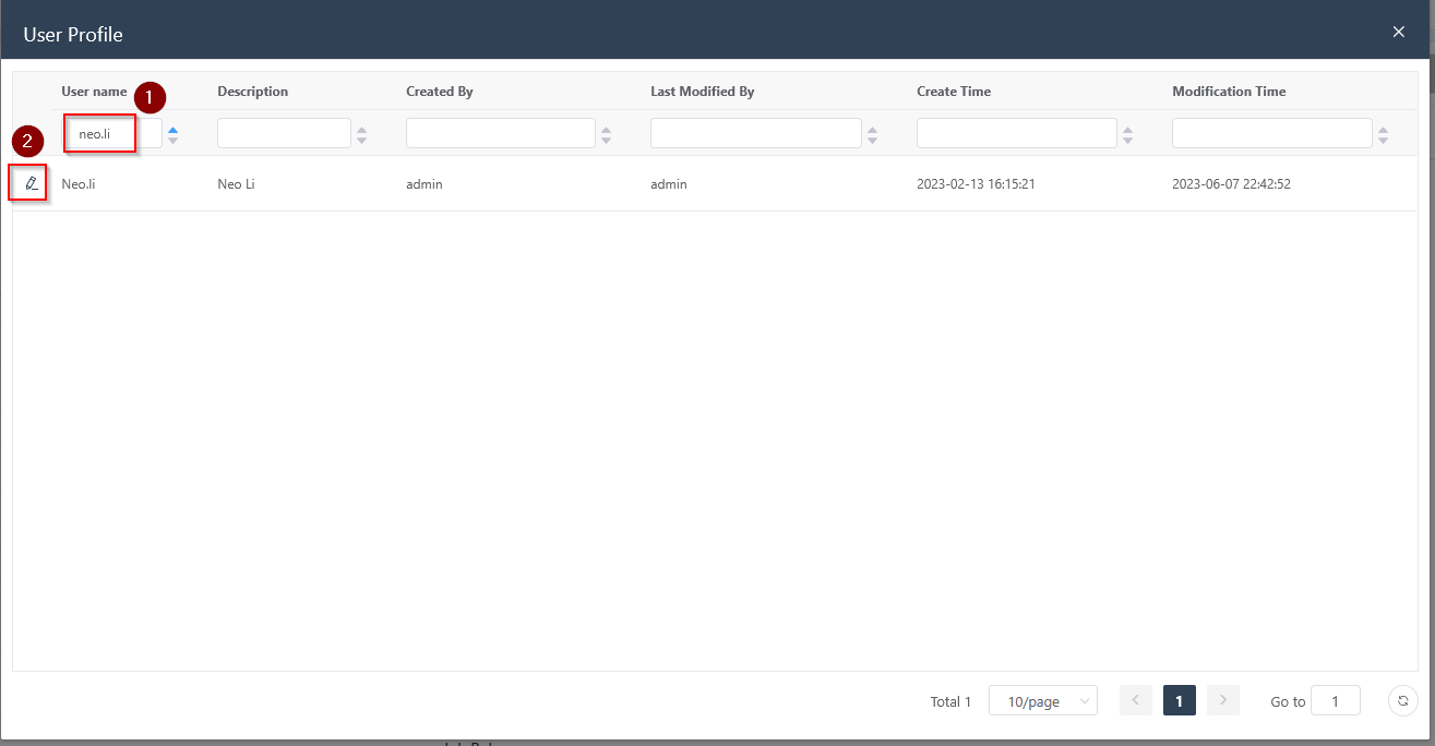 3, Input the login user name and hit ENTER. then Edit the user profile by clicking on the PEN icon.
