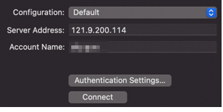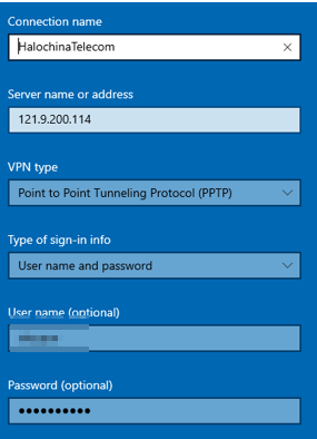 HaloChinaTelecom: Connection name: HaloChinaTelecom Server name of address: 121.9.200.114 VPN type: PPTP Type of sign-in info: User name and password User name: HSS\firstname.lastname or haloasia\ firstname.lastname Password: window login password