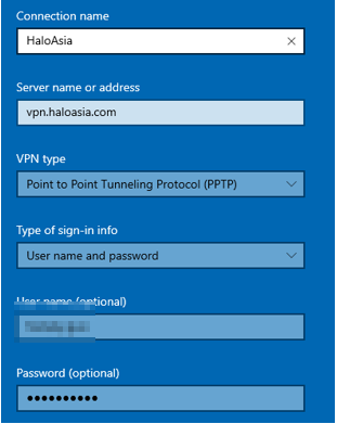 HaloAsia: Connection name: HaloAsia Server name of address: vpn.haloasia.com VPN type: PPTP Type of sign-in info: User name and password User name: HSS\firstname.lastname or haloasia\ firstname.lastname Password: window login password