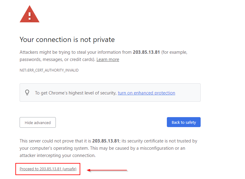 1, Start Edge, Chrome, or Safari browser, choose one of the link below, click “proceed to 203.85.13.81 (unsafe)”.