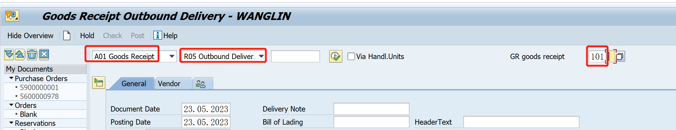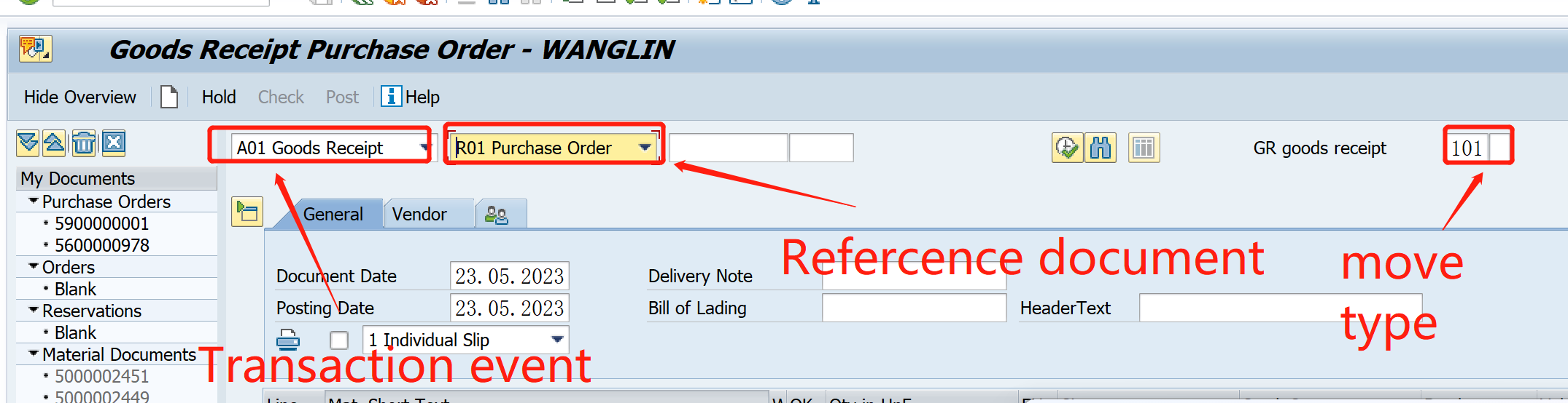 2、If receiving goods according to PO, select A01 for transaction event and R01 for reference document and 101 for move type.