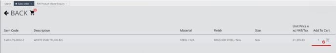 - When you search a delisted product in sales order, the Cart would be in grey and cannot be added to. Instead you can choose by converting by stock.
