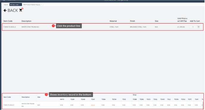 - Click the product line in search result, it will show inventory record in the bottom box.