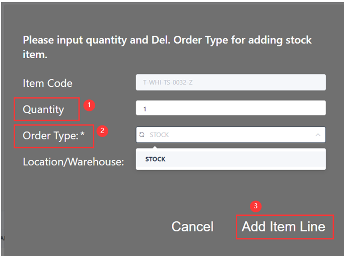 - Click the stock location, add the quantity and select STOCK order type in the pop-up page.
