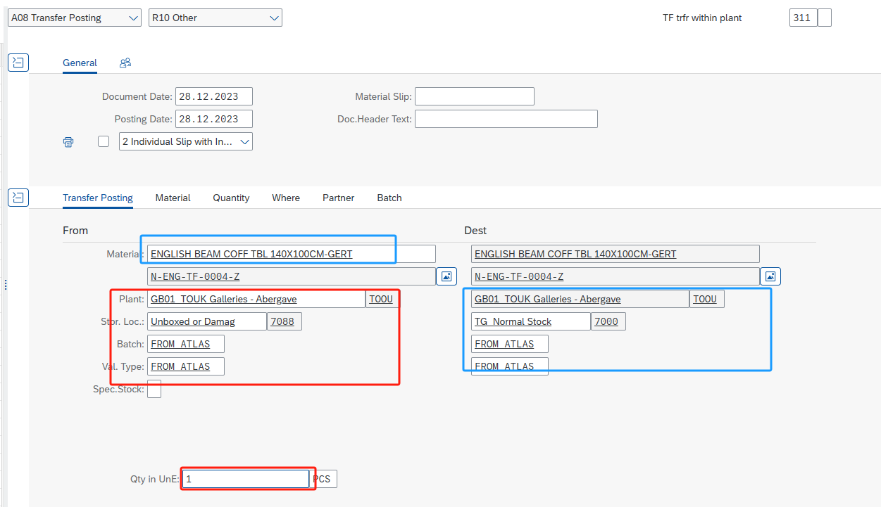 2、execute t-code:MIGO with MVT=311 to transfer stock from wrong location to 7000 storage location