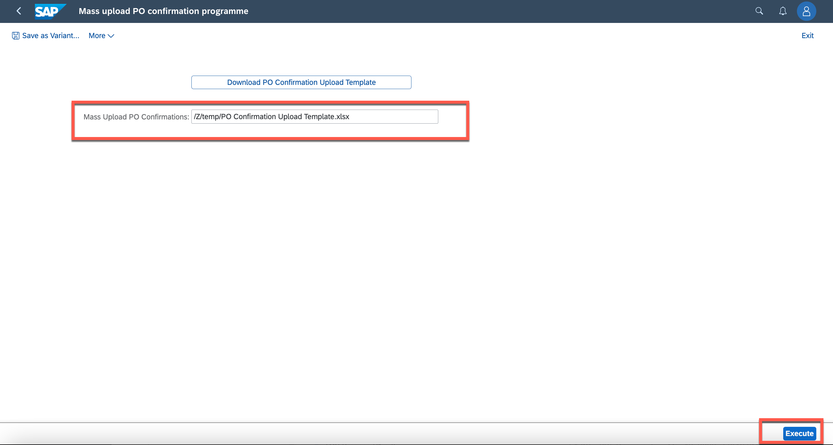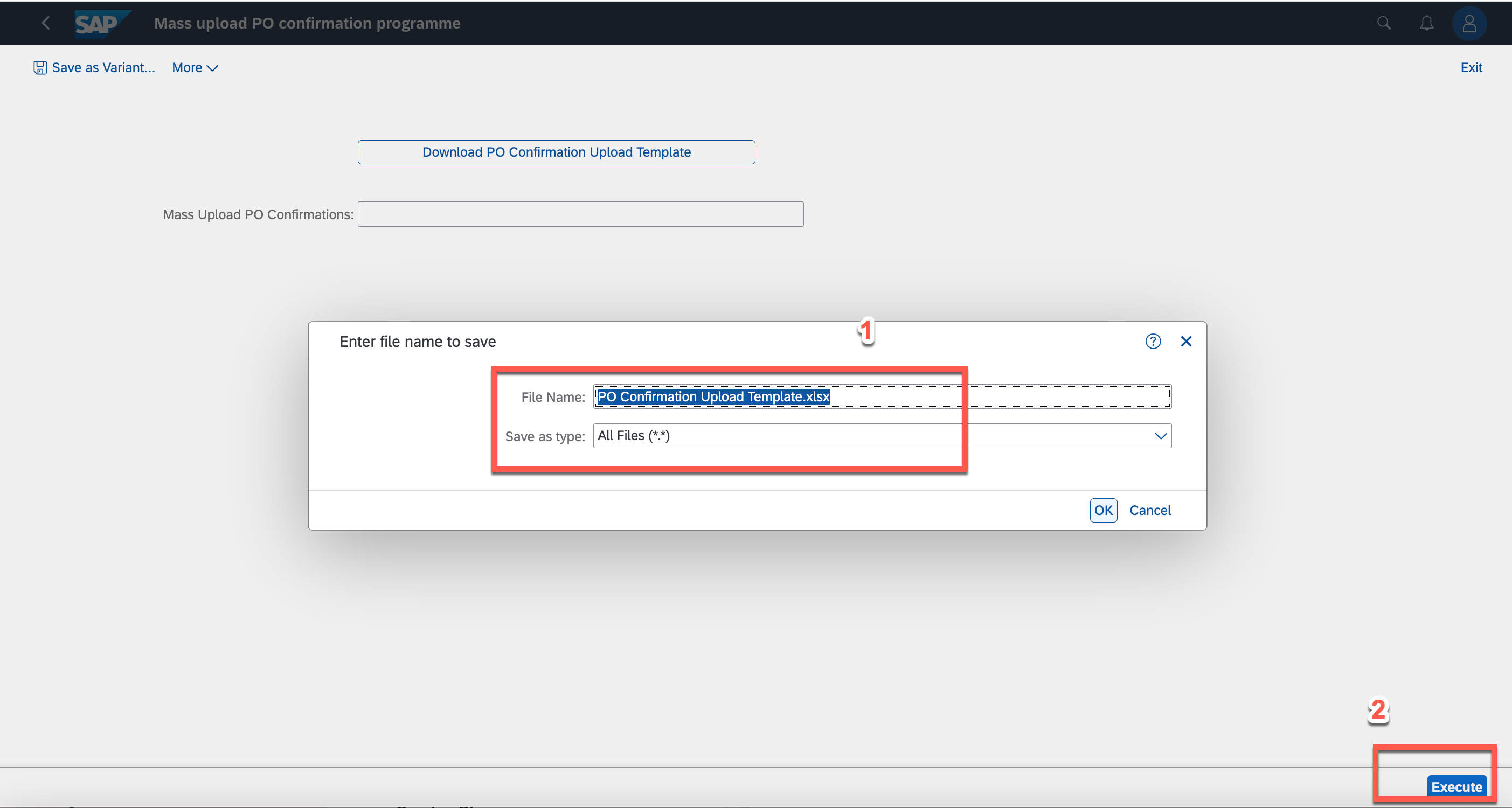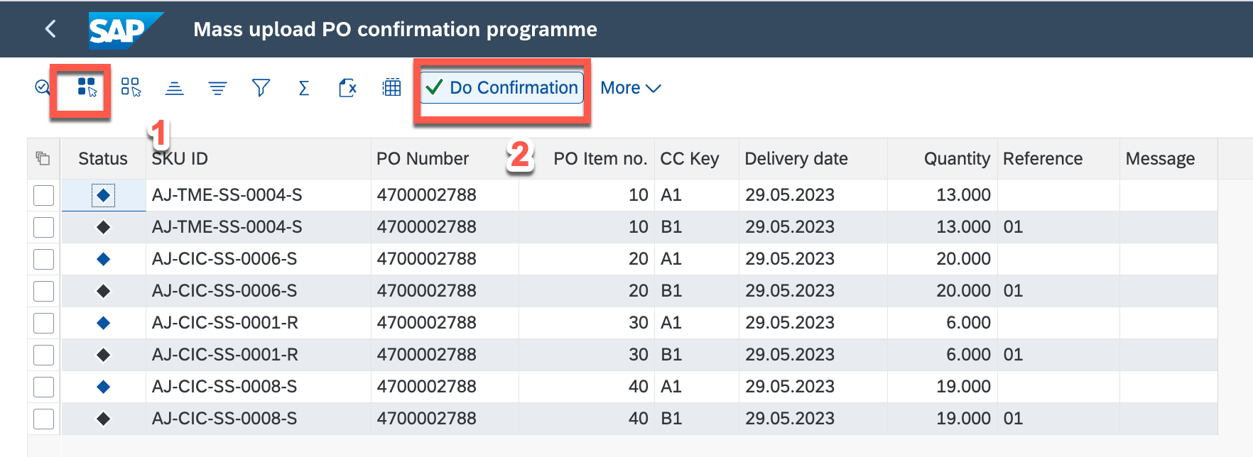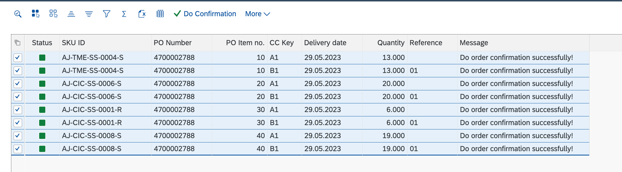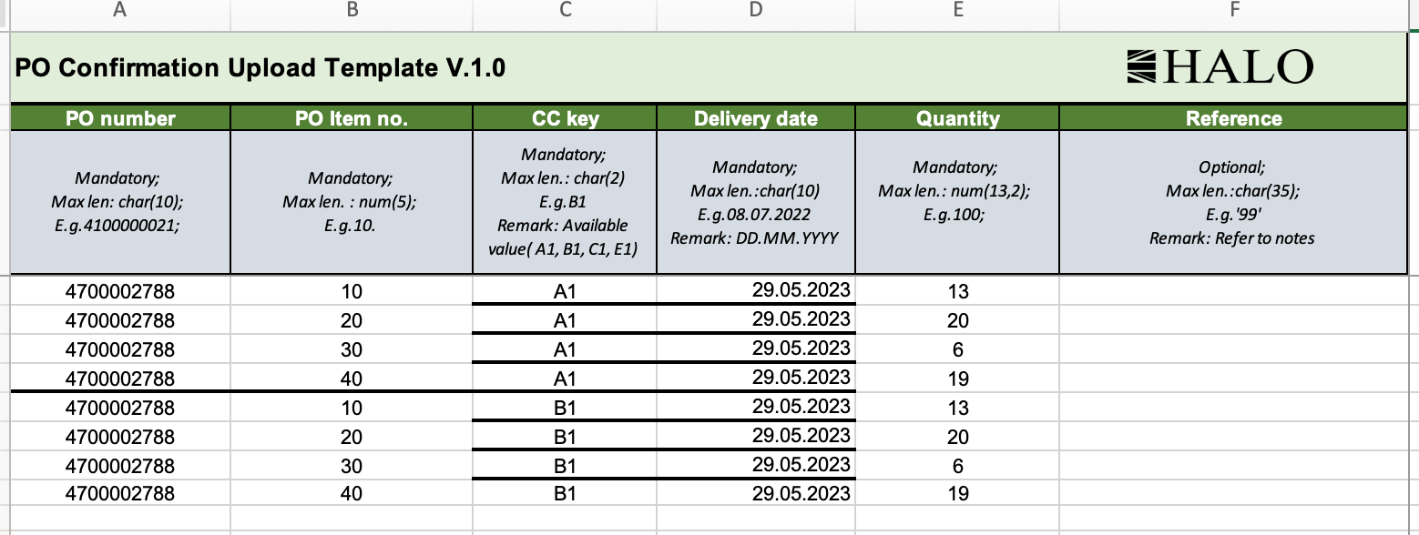 Fill in PO line and QTY and add A1 and C1 for PO confirmation