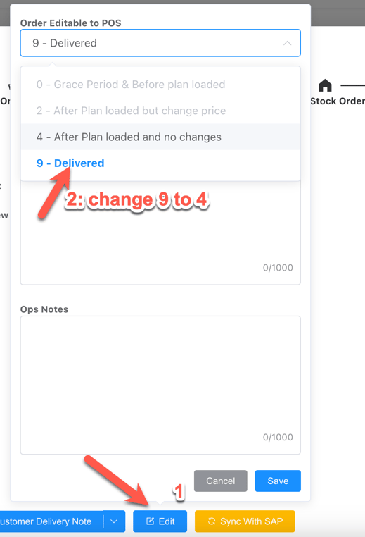 9. Then, change the TMS status from 9 to 4 using the 'Edit' button in the TMS order and once again sync with SAP using the orange button (the order status should then revert to '0-Grace Period & Before Plan Loaded':