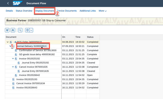 2. You then need to check if the billing of the order has been cleared by finance team - To do this, click once on the order number (step 1) and then click Display Document Flow (step 2)