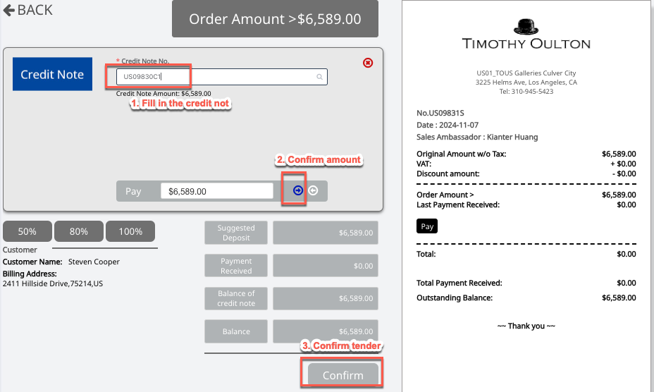 (1) Create an order for the associated customer and confirm the specified credit note as the tender.