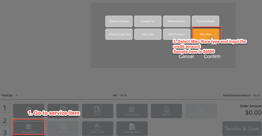 Step2: Create a virtual order for the associated customer with the service item 'Misc. Rare,' and link it to credit note US09830C1.