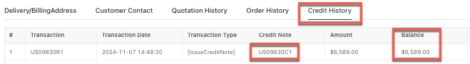 Step1: Check and select the credit note (e.g., US09830C1) associated with the customer