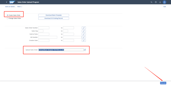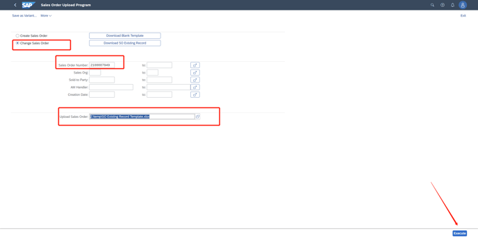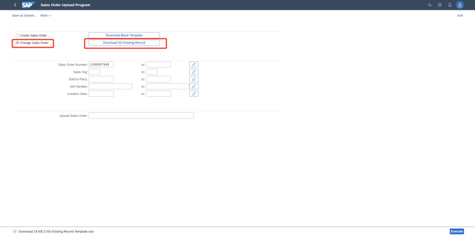 1. Click "change Sales order" and then Click Down load SO exisiting Record