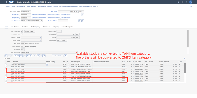 PS: Like the case above, Red Line reminds Stock QTY<SO QTY. If it converts to Stock number and filled the QTY, it will split into two lines. One is TAN item category, the other is ZMTO item category.