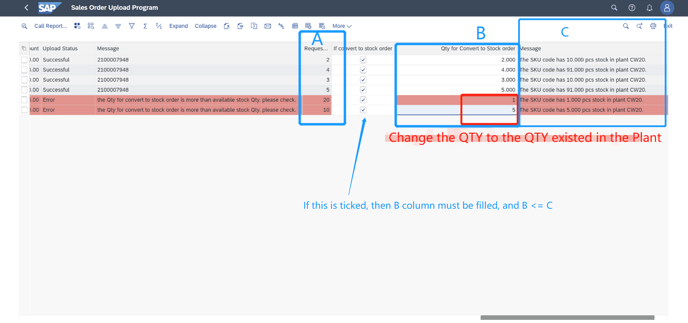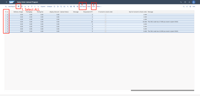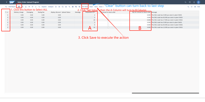3. In the red lines,(not have enough available stock in the plant), if the "If convert wo stock order" is selected, then B Column must be filled, less than or eaqual to C Column, B <= C)and Choose "Save"